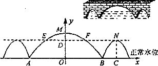 如图为临沂市滨河景观一处石拱桥,三孔桥横截面的三个孔都呈抛物线形。两小孔形状、大小都相同。正常水位时,大孔水面宽度AB=20米,顶点M距水面6米(即MO=6米),小孔顶点N距水面4.5米(即NC=4.5米)。当水位上涨刚好淹没小孔时,借助图中的直角坐标系,求此时大孔的水面宽度EF。