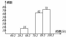 (2)若将得分转化为等级,规定得分低于59.5分评为“D”,59.5-69.5分评为“C”,69.5-89.5分评为“B”,89.5-100.5分评为“A”。这次全区七年级参加竞赛的学生约有多少学生参赛成绩被评为“D”?如果随机抽查一名参赛学生的成绩等级,则这名学生的成绩被评为“A”、“B”、“C”、“D”哪一个等级的可能性大?请说明理由。