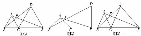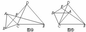 (3)将图③中的△ABC绕点C旋转(点F不与点A、B重合),得图④或图⑤。在图④中,∠AFB与∠α的数量关系是________________;在图⑤中,∠AFB与∠α的数量关系是________________。请你任选其中一个结论证明。