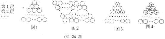26.(本题满分8分) 图1是由若干个小圆圈堆成的一个形如正三角形的图案,最上面一层有一个圆圈,以下各层均比上一层多一个圆圈,一共堆了n层.将图1倒置后与原图1拼成图2的形状,这样我们可以算出图1中所有圆圈的个数为