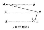 22.(本题满分8分)如图,已知AB//CD,AB//EF,∠1=25°,∠2=115°,则AD与DF是否垂直,说明理由.