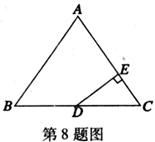 8.如图所示,△ABC中,AB=AC,D为BC边上的一点,DE⊥AC于E,若∠A=70º,则∠BDE的度数为