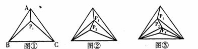 ABC内有一点P1,当P1、A、B、C没有任何三点在同一直线上时,则可构成3个互不重叠的小三角形(如图①)。