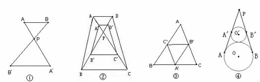 10.下列说法:(1)如图①,AB//A′B′,则△ABP与△A′B′P位似;(2)如图②,AD//A′D′//B′C′//BC,则梯形ABCD与梯形A′B′C′D′位似;(3)如图③,点