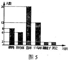 8.“阳光体育”运动在我市轰轰烈烈开展,为了解同学们最喜爱的阳光体育运动项目,小王对本班50名同学进行了跳绳,羽毛球,篮球,乒乓球,踢毽子等运动项目最喜爱人数的调查,并根据调查结果绘制了如图5的人数分布直方图,若将其转化为扇形统计图,那么最喜爱打篮球的人数所在扇形区域的圆心角的度数为