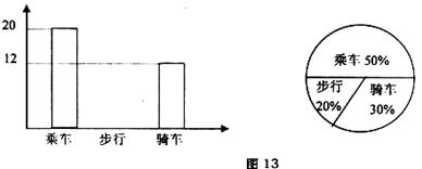 22.(本题满分9分)图13是某班学生外出乘车、步行、骑车的人数分布直方图和扇形分布图。