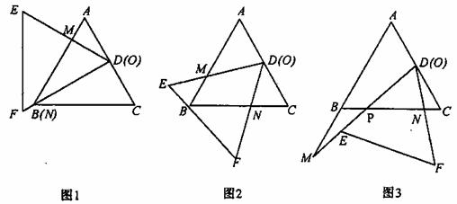 25.我们做如下的规定:如果一个三角形在运动变化时保持形状和大小不变,则把这样的三角形称为三角形板。把两块边长为4的等边三角形板ABC和DEF叠放在一起,使三角形板DEF的顶点D与三角形板ABC的AC边中点O重合,把三角形板ABC固定不动,让三角形板EDF绕点O旋转,设射线DE与射线AB相交于点M,射线DF与线段BC 相交于点N.