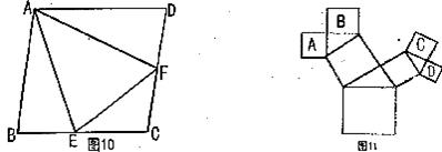 18.如图11,图中所有的四边形都是正方形,所有的三角形都是直角三角形,其中最大的正方形的边长是7cm,则正方形A、B、C、D的面积之和为 。