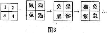 10、四个电子宠物排座位,一开始,小鼠、小猴、小免、小猫分别坐在1、2、3、4号座位上(如图3所示),以后它们不停地变换位置,第一次上下两排交换,第二次是在第一次换位后,再左右两列交换位置,第三次上下两排交换,第四次再左右两列交换……这样一直下去,则第2005次交换位置后,小兔子坐在( )号位上。