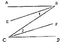 5、(10’)己知BE平分∠ABC,CF平分∠BCD,若∠1=∠2,试确定直线AB与CD的位置关系,并说明理由。