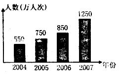 近年来,某市旅游事业蓬勃发展,吸引大量游客前来旅游观光。下面的条形统计图反映了该市2004~2007年游客总人数情况。根据统计图提供的信息,解决以下问题: