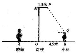 如图所示,点P表示广场的一盏照明灯.(1)请你在图中画出晓敏在照明灯P照射下的影子(用线段表示);(2)若小丽到灯柱MO的距离为4.5米,照明灯P到灯柱的距离为1.5米,小丽目测照明灯P的仰角为55°,她的目高QB为1.6米,试求照明灯P到地面的距离(结果精确到0.1米).