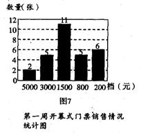 15.北京奥组委从4月15日起分三个阶段向境内公众销售门票,开幕式门票分为五个档 次,票价分别为人民币5000元、3000元、1500元、800元和200元.某网点第一周内开幕式门票的销售情况见统计图,那么第一周售出的门票票价的众数是( ).