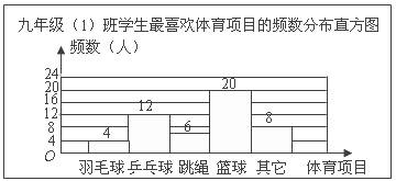 9.体育老师对九年级(1)班学生“你最喜欢的体育项目是什么?(只写一项)”的问题进行了调查,把所得数据绘制成频数分布直方图(如图).由图可知,最喜欢篮球的频率是 ( )