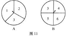 如图13,有两个可以自由转动的均匀转盘A,B,转盘A被平均分成3等份,分别标上1,2,3 三个数字;转盘B被平均分成4等份,分别标上3,4,5,6四个数字。有人为甲、乙两人设计了一个游戏规则:自由转动转盘A与B,转盘停止后,指针各指向一个数字,将指针所指的两个数字相加,如果和是6,那么甲获胜,否则为乙获胜。