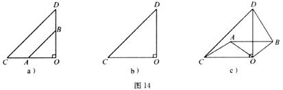 如图14a,两个不全等的等腰直角三角形OAB和OCD叠放在一起,并且有公共的直角顶点O。