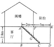 25.(本题满分9分)汪老师要装修自己带阁楼的新居(图为新居剖面图),在建造客厅到阁楼的楼梯AC时,为避免上楼时墙角F碰头,设计墙角F到楼梯的竖直距离FG为1.75m.他量得客厅高AB=2.8m,楼梯洞口宽AF=2m,阁楼阳台宽EF=3m.请你帮助汪老师解决下列问题: