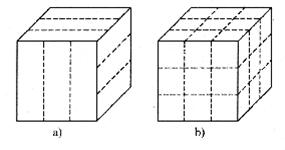 有一块表面是咖啡色,内部是白色,形状是正方体的烤面包,小明用刀在它的上表面、 前表面和右侧表面沿虚线各切两刀,如图a所示,将它切成若干块小正方体形面包,如图b所示.