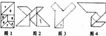 21.(8分)动手做一做:某校教具制作车间有等腰直角三角形正方形、平形四边形的塑料板若干块,数学兴趣小组的同学利用其中7块恰好拼成一个矩形(如图1),后来又用它们拼出了XYZ等字母模型(如图2、图3、图4),每个塑料板保持图1的标号不变,请你参与: