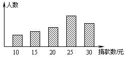 振兴中学某班的学生对本校学生会倡导的“抗震救灾,众志成城”自愿捐款活动进行抽样调查,得到了一组学生捐款情况的数据.下图是根据这组数据绘制的统计图,图中从左到右各长方形的高度之比为3︰4︰5︰8︰6,又知此次调查中捐款25元和30元的学生一共42人.