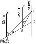 如图,AC是某市环城路的一段,AE,BF,CD都是南北方向的街道,其与环城路AC的交叉路口分别是A,B,C.经测量花卉世界D位于点A的北偏东45°方向、点B的北偏东30°方向上,AB=2km,∠DAC=15°.