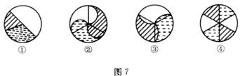 15.学校有一个圆形花坛,现要求将它三等分,以便在上面种植三种不同的花,你认为符合设计要求的图案是图7中的 (将所有符合设计要求的图案序号填上)。