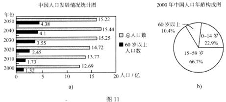 图11a和图11b是某报纸公布的中国人口发展情况统计图和2000年中国人口年龄构成图。请根据图中提供的信息,回答下列问题:
