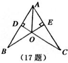 17.如图,已知CD⊥AB,BE⊥AC,垂足分别为D、E,BE、CD交于点O,且OD=OE,若∠DAO=30°,则∠B=__________。