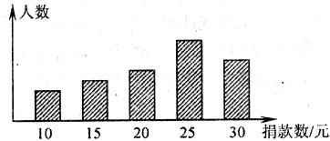 5、振兴中学某班的学生对本校学生会倡导的“抗震救灾,众志成城”自愿捐款活动进行抽样调查,得到了一组学生捐款情况的数据。下图是根据这组数据绘制的统计图,图中从左到右各长方形的高度之比为3︰4︰5︰8︰6,又知此次调查中捐款25元和30元的学生一共42人。