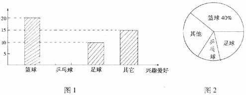 24.(8分)为响应国家要求中小学生每天锻炼1小时的号召,某校开展了形式多样的“阳光体育运动”活动,小明对某班同学参加锻炼的情况进行了统计并绘制了下图1和图2所示的统计图,请在图1中将“乒乓球”部分的图形补充完整,并回答。