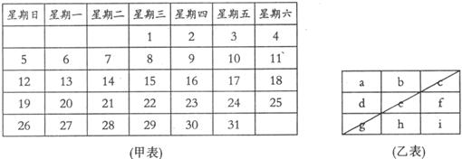 33.在甲表所示的2008年10月份的月历中,用长方形方框任意圈出3×3个数(如乙表)。