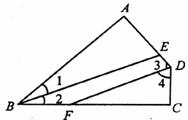 如下图,四边形ABCD中,∠A=∠C=90°,BE平分∠ABC,DF平分∠ADC。试问BE与DF有何位置关系?试说明理由。