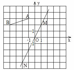 如图,在方格纸上建立平面直角坐标系,线段AB的两个端点都在格点上,直线MN经过坐标原点,且点M的坐标是(1,2)。