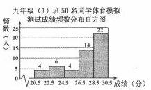 6.九年级(1)班共50名同学,下图是该班体育模拟测试成绩的频数分布直方图(满分为30分,成绩均为整数).若将不低于29分的成绩评为优秀,则该班此次成绩优秀的同学人数占全班人数的百分比是