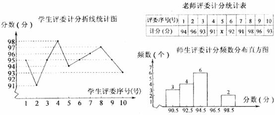 (3)计分办法规定:老师、学生评委的计分各去掉一个最高分、一个最低分,分别计算平均分,别且按老师、学生各占60%、40%的方法计算各班最后得分。已知甲班最后得分为94.4分,求统计表中