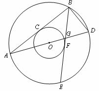 如图,两个同心圆的圆心是O,大圆的半径为13,小圆的半径为5,AD是大圆的直径。大圆的弦AB,BE分别与小圆相切于点C,F。AD,BE相交于点G,连接BD.