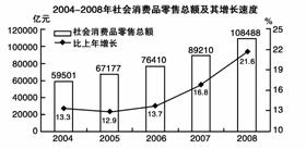 5.2004-2008年社会消费品零售总额及增长速度情况如下图所示,那么社会消费品零售总额比上年增长最快的年份是