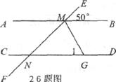 26.(本题8分)如图,AB//CD,EF分别交AB、CD于M、N,∠EMB=50°,MG平分∠BMF,MG交CD于G,求∠l的度数.