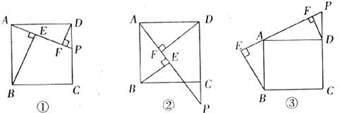 在正方形ABCD中,点P是CD上一动点,连接PA,分别过点B、D作BE⊥PA,DF⊥PA,垂足为E、F(如图①)。