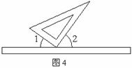 15. 如图4,桌面上平放着一块三角板和一把直尺,小明将三角板的直角顶点紧靠直尺的边缘,他发现无论是将三角板绕直角顶点旋转,还是将三角板沿直尺平移,∠1与∠2的和总是保持不变,那么∠1与∠2的和是_______度.
