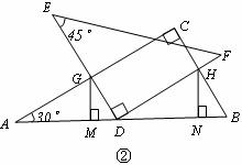 图中是一副三角板,45°的三角板Rt△DEF的直角顶点D恰好在30°的三角板Rt△ABC斜边AB的中点处,∠A=30o,∠E= 45o,∠EDF=∠ACB=90 o ,DE交AC于点G,GM⊥AB于M.