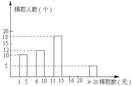 19.(7分)“一方有难,八方支援”,在四川汶川大地震后,某市文华中学全体师生踊跃捐款,向灾区人民献爱心。为了了解该校学生捐款情况,对其中60个学生捐款数x(元)分五组进行统计,第一组:1≤x≤5,第二组:6≤x≤10,第三组:11≤x≤15,第四组:16≤x≤20;,第五组:x≥21,并绘制如下频数分布直方图(假定每名学生捐款数均为整数),解答下列问题: