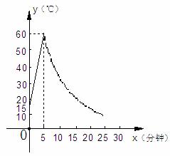 22、(本题满分10分)观察:制作一种产品,需先将材料加热达到60℃后,再进行操作.设该材料温度为y(℃),从加热开始计算的时间为x(分钟).据了解,设该材料加热时,温度y与时间x成一次函数关系;停止加热进行操作时,温度y与时间x成反比例关系(如图).已知该材料在操作加工前的温度为15℃,加热5分钟后温度达到60℃.