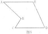 小明通过探究后发现:在一个四边形中,只要有一组对边平行,就可以剪拼成平行四边形.如图5的凸多边形中,AE=CD,AE∥CD,能否象上面剪切方法一样沿一条直线进行剪切,拼成一个平行四边形?若能,请你在图中画出剪拼的示意图并作必要的文字说明;若不能,简要说明理由.