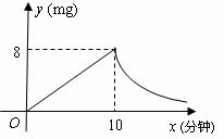 为预防“手足口病”,某校对教室进行“药熏消毒”.已知药物燃烧阶段,室内每立方米空气中的含药量y(mg)与燃烧时间x(分钟)成正比例;燃烧后,y与x成反比例(如图所示).现测得药物10分钟燃烧完,此时教室内每立方米空气含药量为8 mg.根据以上信息,解答下列问题: