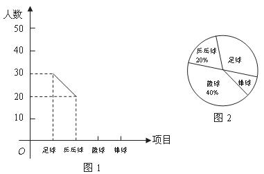 20.(本题满分9分)某中学学生会为了解该校学生喜欢球类活动的情况,采取抽样调查的方法,从足球、乒乓球、篮球、排球等四个方面调查了若干名学生的兴趣爱好,并将调查的结果绘制成如下的两幅不完整的统计图(如图1,图2要求每位同学只能选择一种自己喜欢的球类;图中用乒乓球、足球、排球、篮球代表喜欢这四种球类中的某一种球类的学生人数),请你根据图中提供的信息解答下列问题: