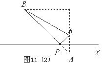 23.恩施州自然风光无限,特别是以“雄、奇、秀、幽、险”著称于世,著名的恩施大峡谷(A)和世界级自然保护区星斗山(B)位于笔直的沪渝高速公路X同侧,AB=50km,A、B到直线X的距离分别为10km和40km,要在沪渝高速公路旁修建一服务区P,向A、B两景区运送游客.小民设计了两种方案,图11(1)是方案一的示意图(AP与直线X垂直,垂足为P),P到A、B的距离之和S1=PA+PB; 图11(2)是方案二的示意图(点A关于直线X的对称点是A',连接BA'交直线X于点P),P到A、B的距离之和S2=PA+PB.