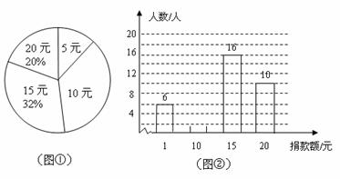 在一次“爱心助学”捐款活动中,九(1)班同学人人拿出自己的零花钱,踊跃捐款,学生捐款额有5元、10元、15元、20元四种情况.根据统计数据绘制了图①和图②两幅尚不完整的统计图.