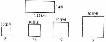 9.要用如下图所示的长方形铁皮做一个圆柱形无盖水桶的侧面,底面用下面的四张正方形铁皮中的一张做,你认为选择哪一张最为省料