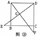 (2)如图③,若点E、F分别在正方形ABCD的CB的延长线和DC的延长线上,且CE=DF,此时上面的绪论①、②是否仍然成立?若成立,请写出证明过程;若不成立,请说明理由。